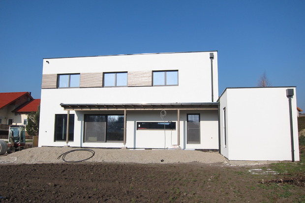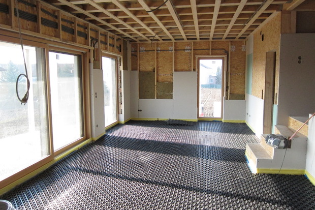 Seit den letzten Fotos hat sich einiges getan, aber man sieht nicht viel. Es ist der Boden isoliert und die Fußbodenheizung verlegt worden. Zusätzlich dazu sind viele Verblechungen gemacht worden und die meisten Dachrinnen dazugekommen.