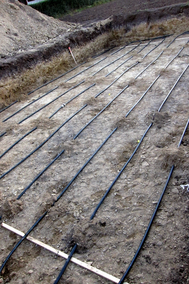 Gestern sind unsere Erdwärmekollektoren verlegt worden. Im Prinzip sind das ein paar Leitungen durch die Sole (wegen der größeren Wärmekapazität) fliesst, die werden dann an die Wärmepumpe angeschlossen und versorgen unser Haus mit Wärme.