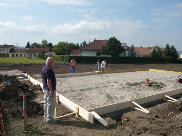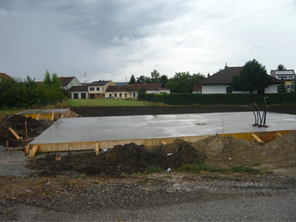 Heute Vormittag wurde dann die Schallung aufgestellt und das Eisen in der Grundplatte verlegt, heute nachmittag ist der Beton gekommen. Und da wars schon ganz gut daß ich am Wochenende auf der Baustelle war und mir aufgefallen ist das ein Kanalauslaß seltsam positioniert ist.